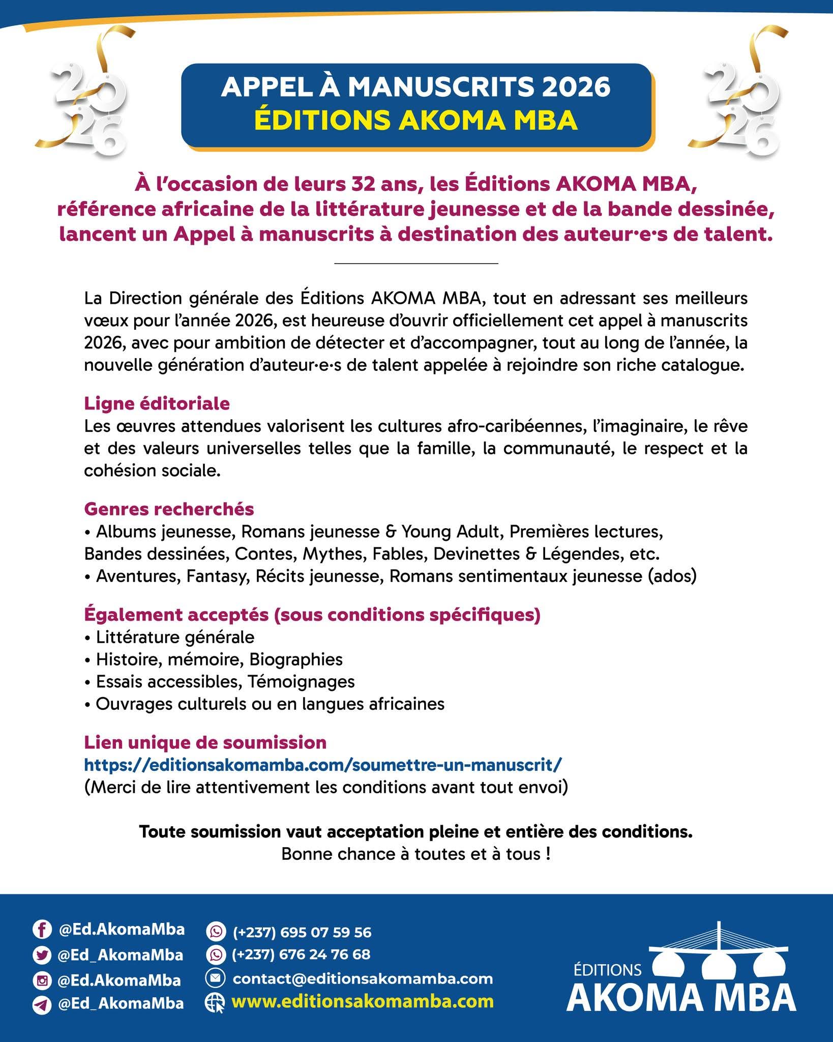 APPEL À MANUSCRITS 2026 – ÉDITIONS AKOMA MBA