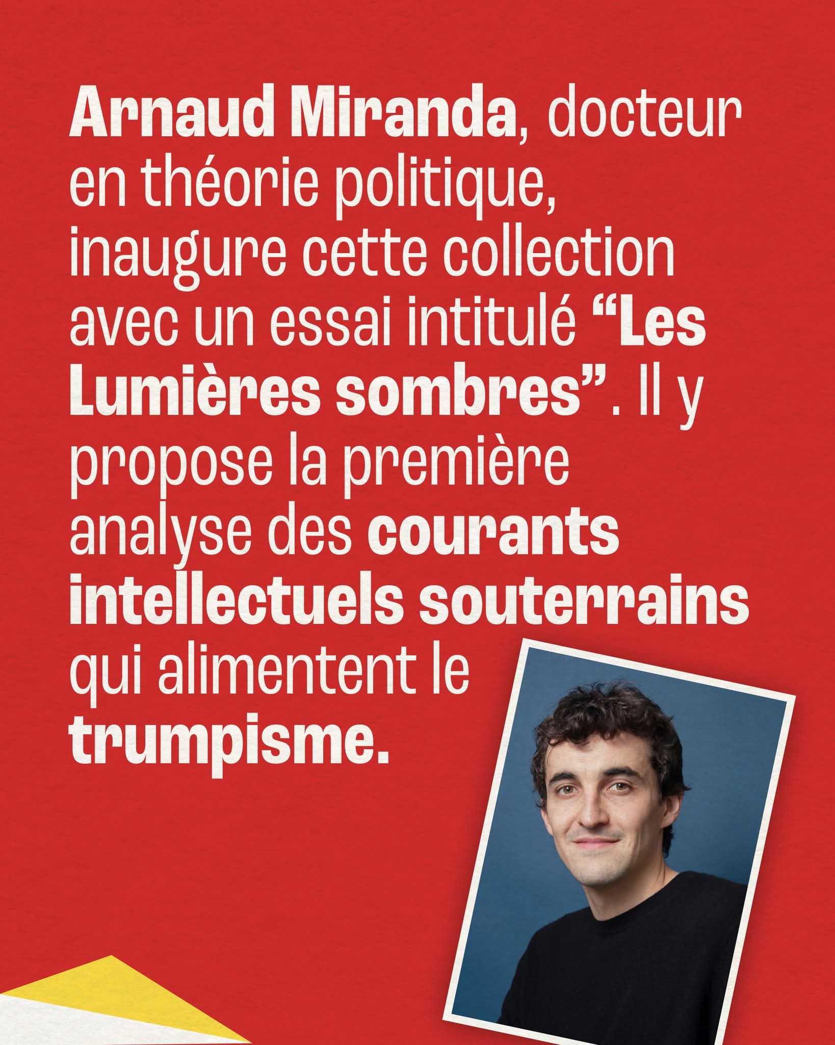 Arnaud Miranda inaugure la collection avec un essai intitulé « Les Lumières sombres ». Dans ce livre, l’auteur propose la première analyse des courants intellectuels souterrains qui alimentent le trumpisme.