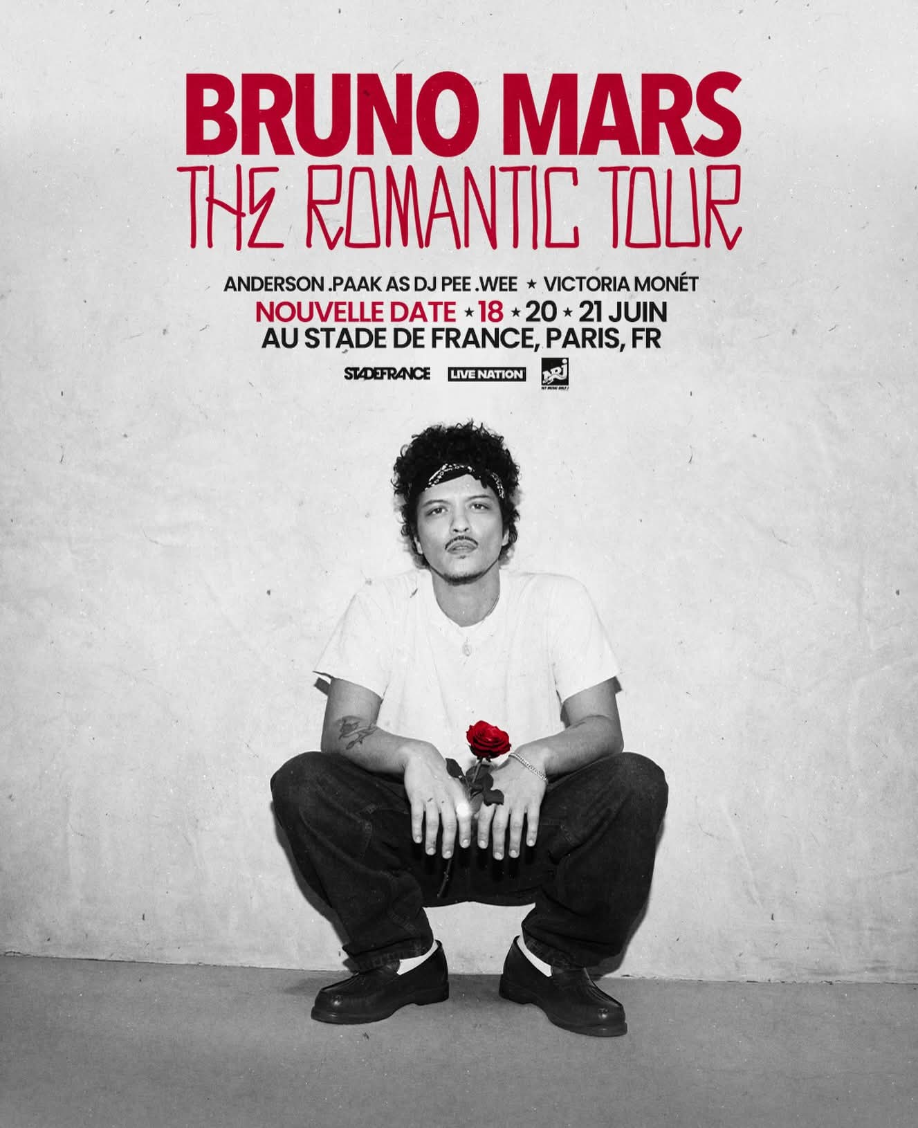 DATE SUPPLÉMENTAIRE : En raison d’une demande incroyable, une 3e date a été ajoutée pour Bruno Mars – The Romantic Tour au Stade de France le 18 juin !