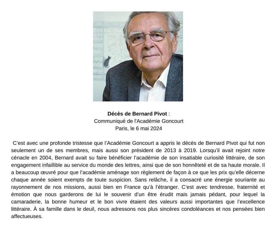 Disparition : Bernard Pivot le Communiqué du Prix Goncourt