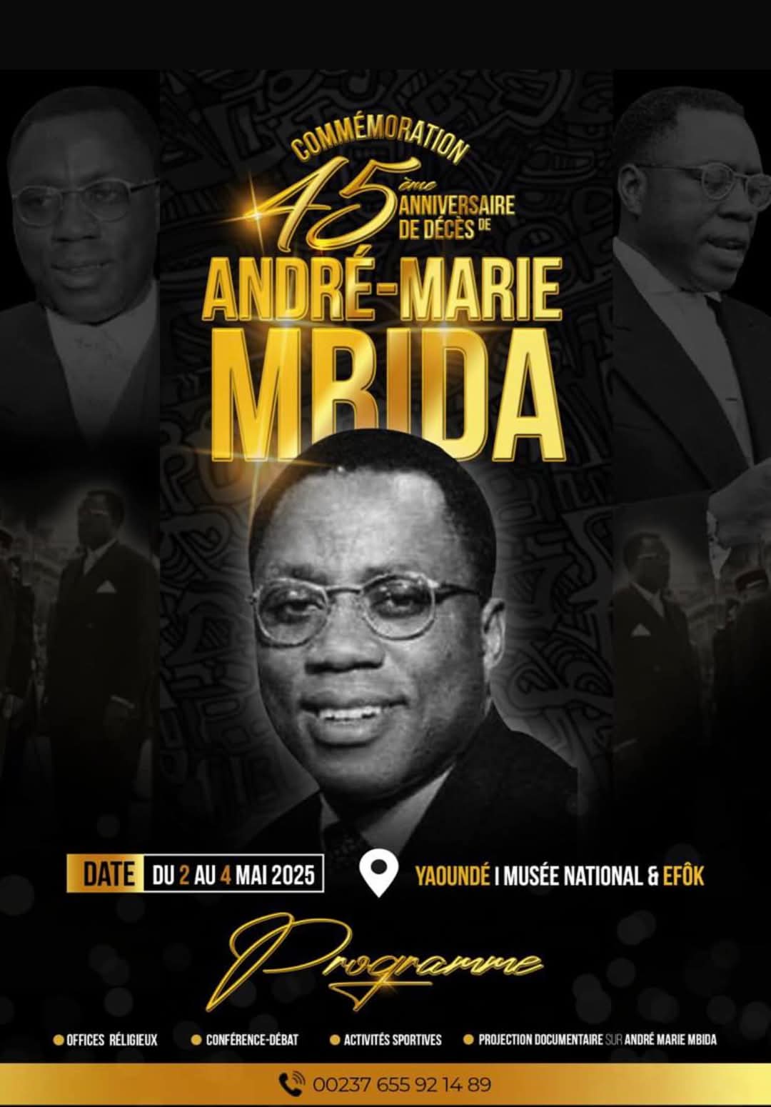 Du 02 au 04 mai 2025, nous rendons hommage à l’un des pères fondateurs du Cameroun, S.E André-Marie MBIDA, premier Premier Ministre Camerounais, Chef de l’État. Cet événement est une occasion de se souvenir de son héritage, de son courage et de sa vision pour notre pays.