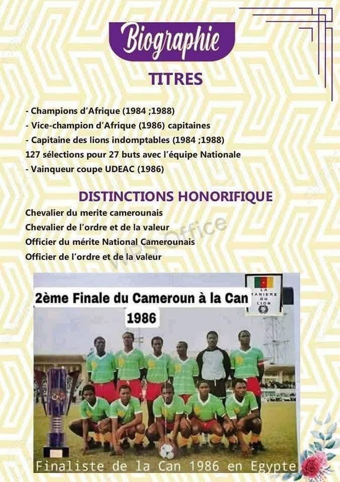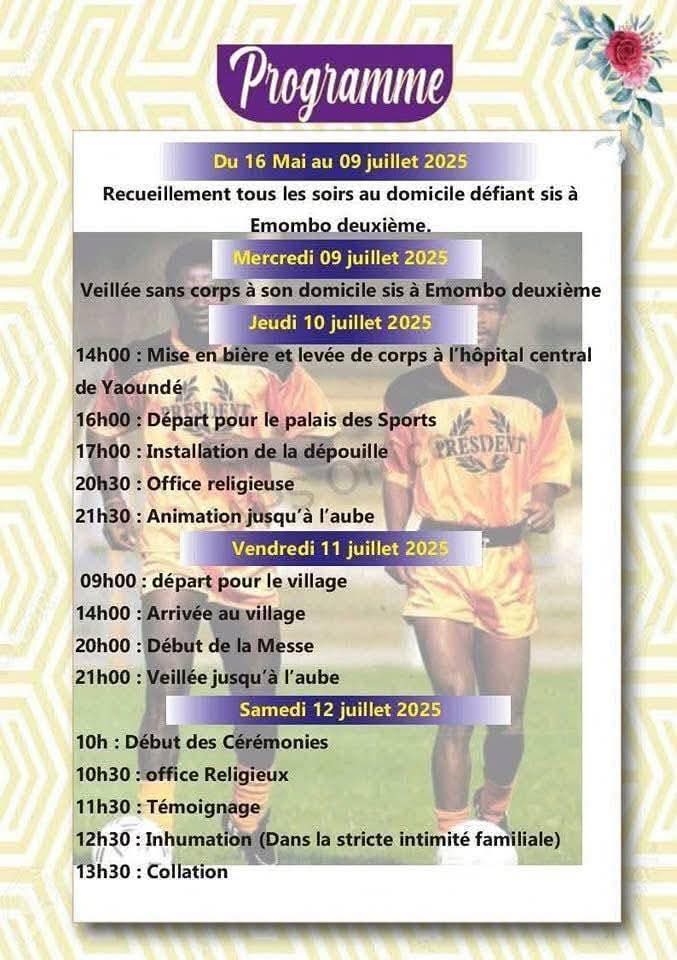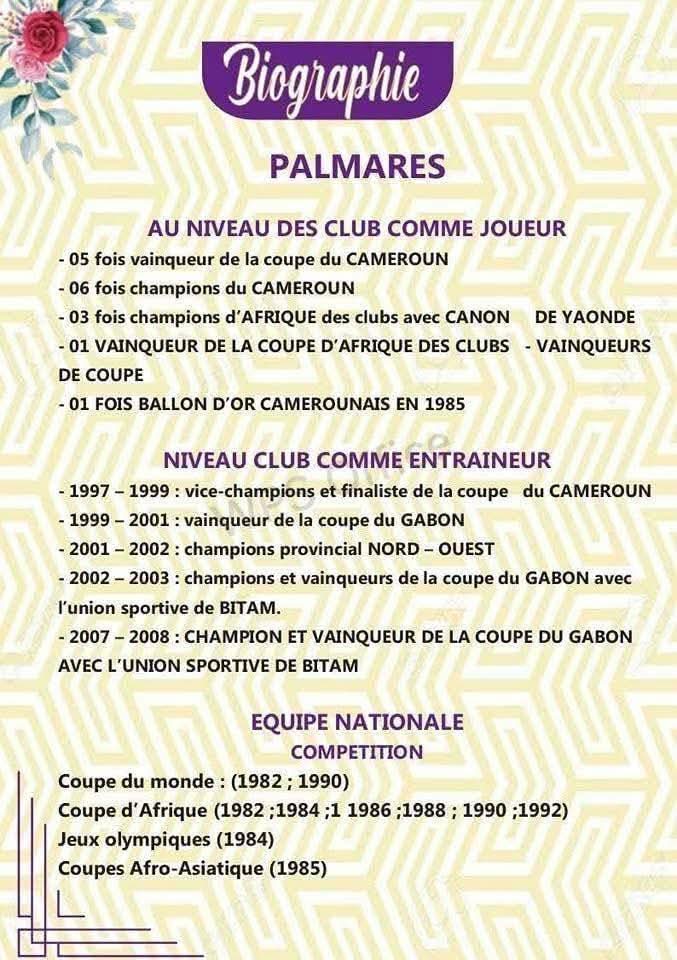 Décédé d’un arrêt cardiaque le 15 Mai dernier,l’ancien lion indomptable va être conduit à sa dernière demeure dans les prochains jours.C’est avec une douleur près qu’insupportable que le peuple camerounais va se prosterner devant sa dépouille pour lui dire un dernier aurevoir. Depuis le lendemain (16 Mai),une série de visites pour apaiser la famille est effectué chaque jour à son domicile (enombo deuxième ),ceci jusqu’au 9 juillet,où la levée sans corps prendra place .