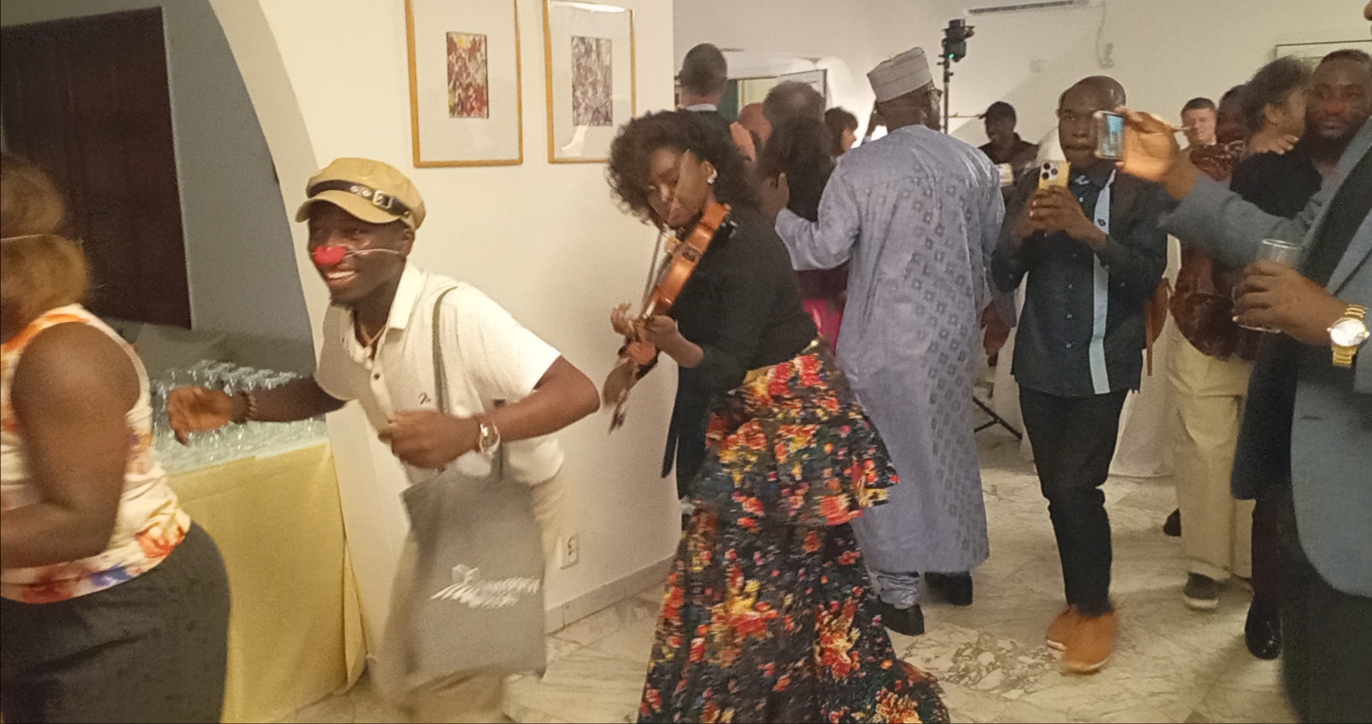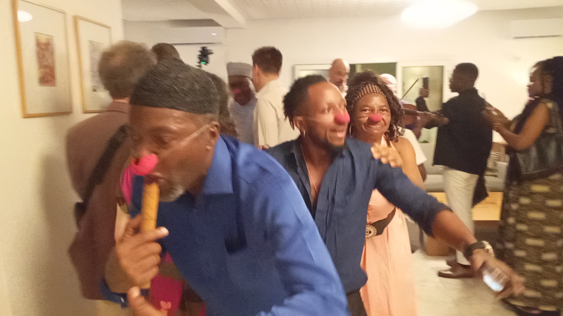 Les sons d’une flûte, d’un violon, tambour et autres instruments de percussion retentissent. Les acteurs entrent chacun de son côté avec des nez rouges comme ceux des clowns. Chacun des convives se trouvent dans un espace où il peut identifier le faciès des acteurs qui jouent aux instruments. Sur un rythme, avec le même tempo, ils occupent progressivement la salle de séjour. La scénographie suscite des interrogations les acteurs jouent sans s’économiser. Les spectateurs qu nous sommes applaudissent et chantent sous l’ordre du joueur de flûte en évoluant en file indienne. A la fin, nous sommes tous embarqué par la représentation n’a pas duré beaucoup plus longtemps c’était bien marqué sur l’invitation presse » soirée de lancement » .