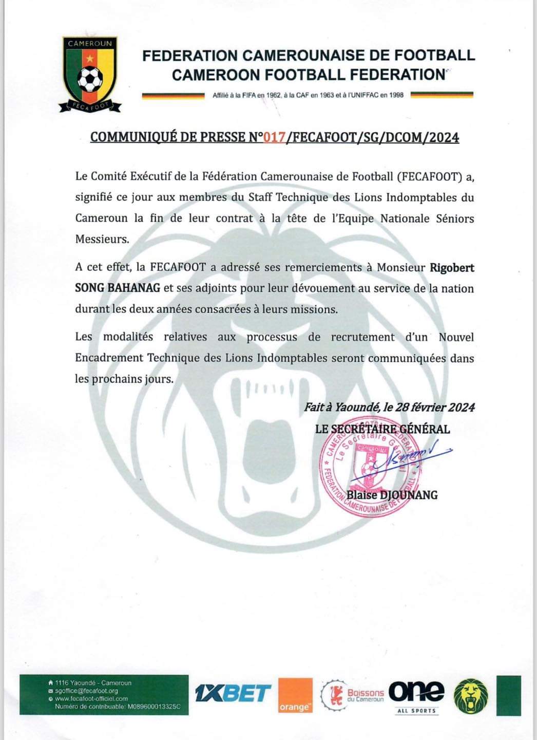 Dans un communiqué officiel rendu par la fédération camerounaise de football dans lequel ils ont annoncé la fin de son contrat.