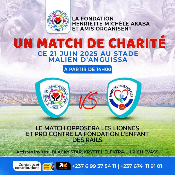 Ce 21 Juin 2025, la Fondation Henriette Michèle Akaba et amis en association avec la Fondation l’enfant des rails organise un match de charité au stade Malien à Anguissa à Yaoundé pour apporter leur soutien aux personnes défavorisées. C’est un évènement qui vise à donner du sourire aux démunis (orphelins, veuves, aveugles, prisonniers etc …) que la lionne Indomptable Akaba Henriette a mis sur pied. Toute personne ayant à cœur de faire un don les numéros de téléphones sont sur l’affiche.