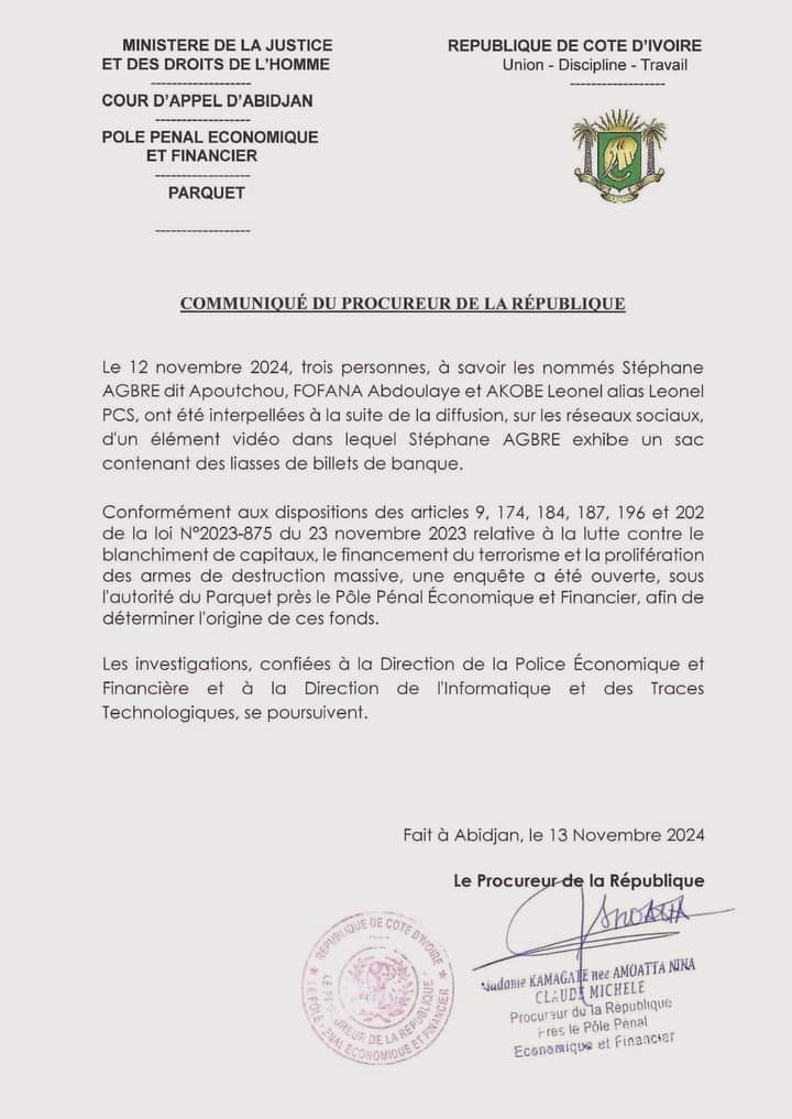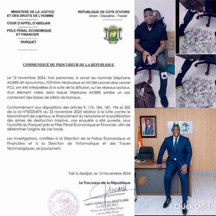 L’influenceur ivoirien Apoutchou National, arrêté après avoir montré des millions de Francs sur les réseaux sociaux (capture en commentaire).