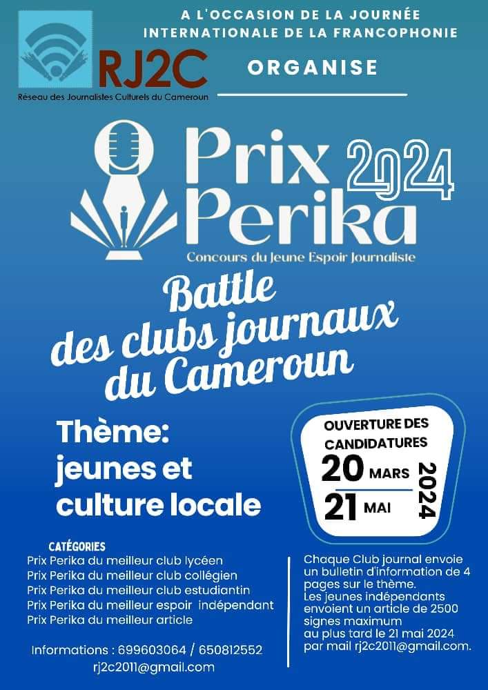 Le Réseau des Journalistes Culturels du Cameroun a lancé officiellement le 20 mars 2024, la 2e édition du Concours du jeune espoir journaliste baptisé Prix Perika sur le thème « Jeunes et culture locale ».