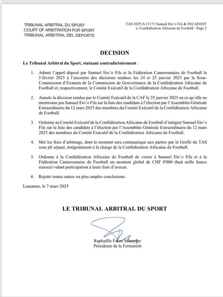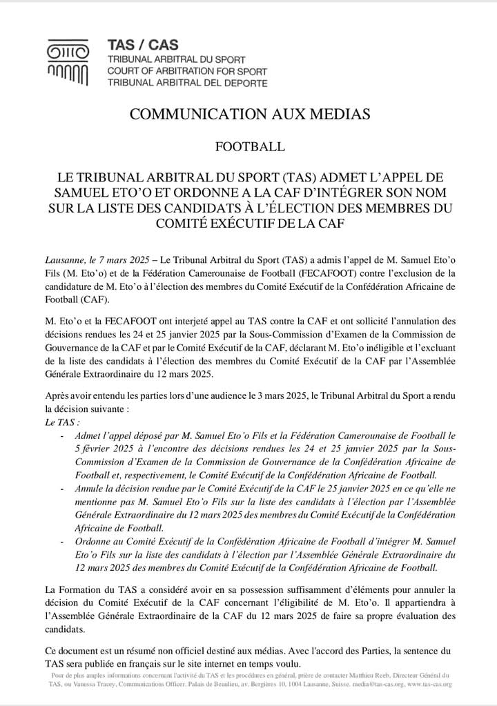 En rappel, l’actuel Président de la Fédération Camerounaise de Football avait des démêlé avec le TAS qui ont étés eclaicirs.
