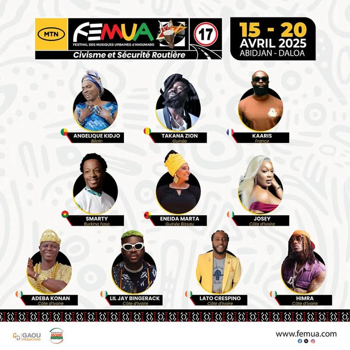 Dix (10) artistes notamment Angélique Kidjo 🇧🇯, Kaaris🇫🇷 , TAKANA ZION 🇬🇳 , Smarty 🇧🇫 , Adeba Konan 🇨🇮 , Eneida Marta 🇬🇼 , Lato Crespino 🇨🇮 , Lil Jay Bingerack 🇨🇮 et Himra 🇨🇮 , vont animer le festival, à Abidjan et Daloa.