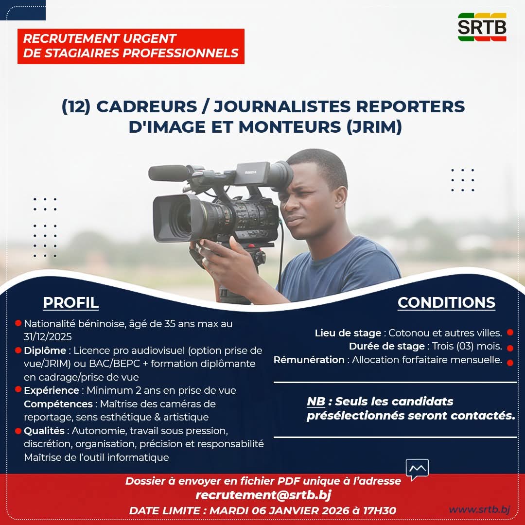 Dans le cadre des Vodun Days et des élections générales de 2026, la SRTB recrute en urgence 12 stagiaires professionnels au poste de Cadreurs / JRIM.