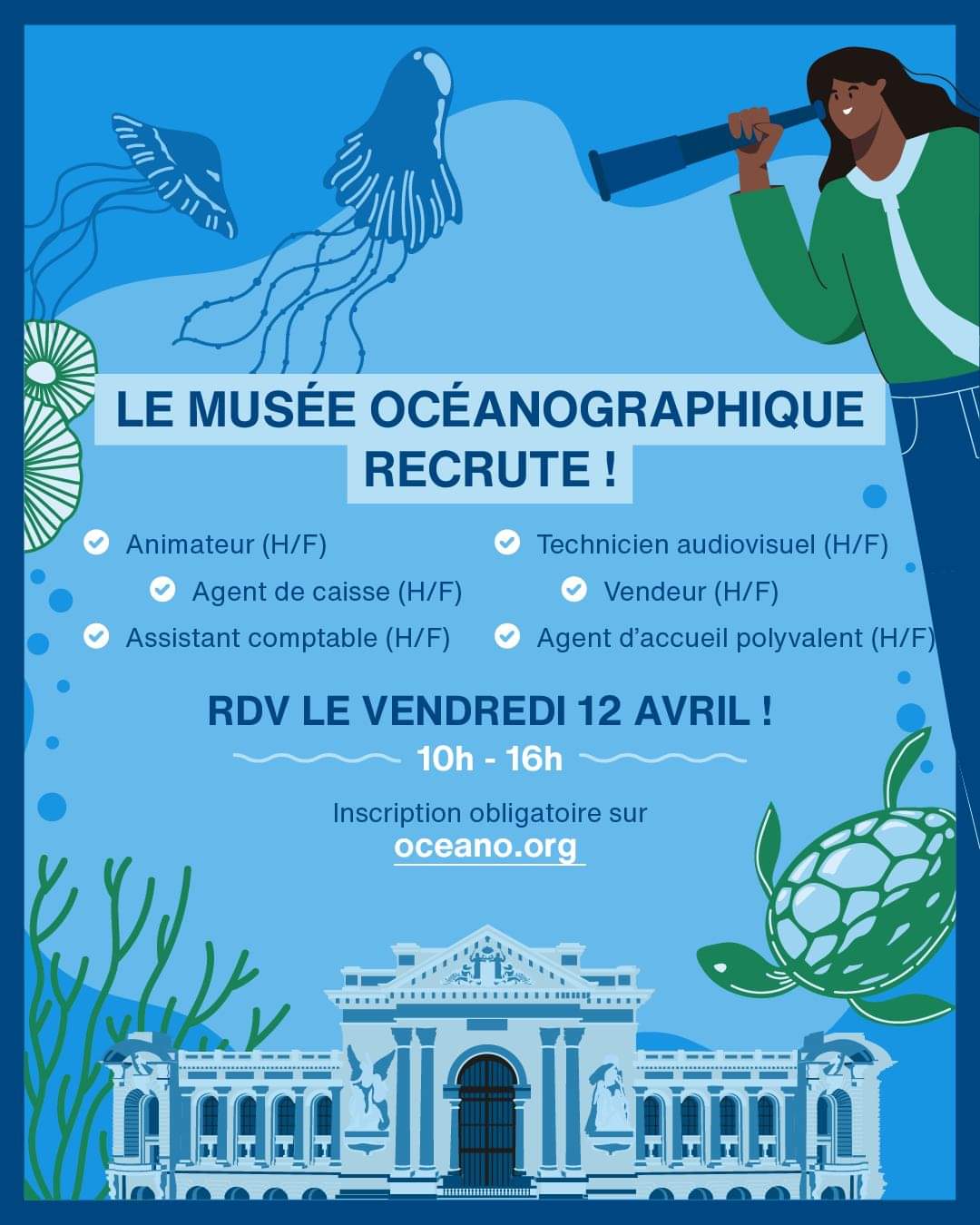 Vendredi 12 avril 2024 entre 10h – 16h au Musée Océanographique de nombreux postes sont ouverts au recrutement inscription obligatoire.