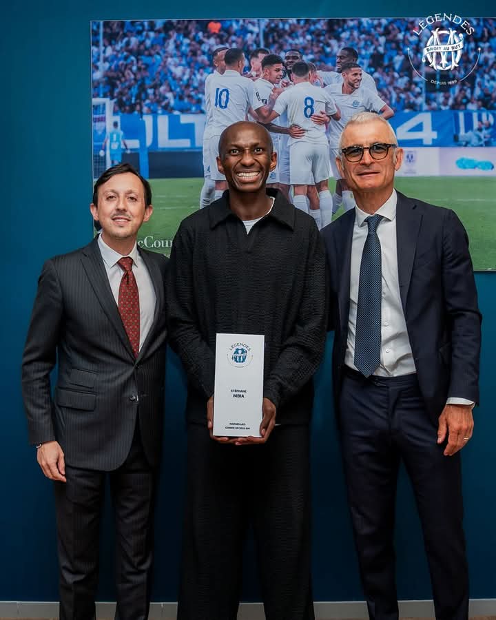 Aux côtés du président de l’Olympique de Marseille Pablo Longoria et du Conseiller institutionnel et sportif Fabrizio Ravanelli, le milieu de terrain camerounais Stéphane M’bia pose fièrement avec son trophée de OMLegendes.